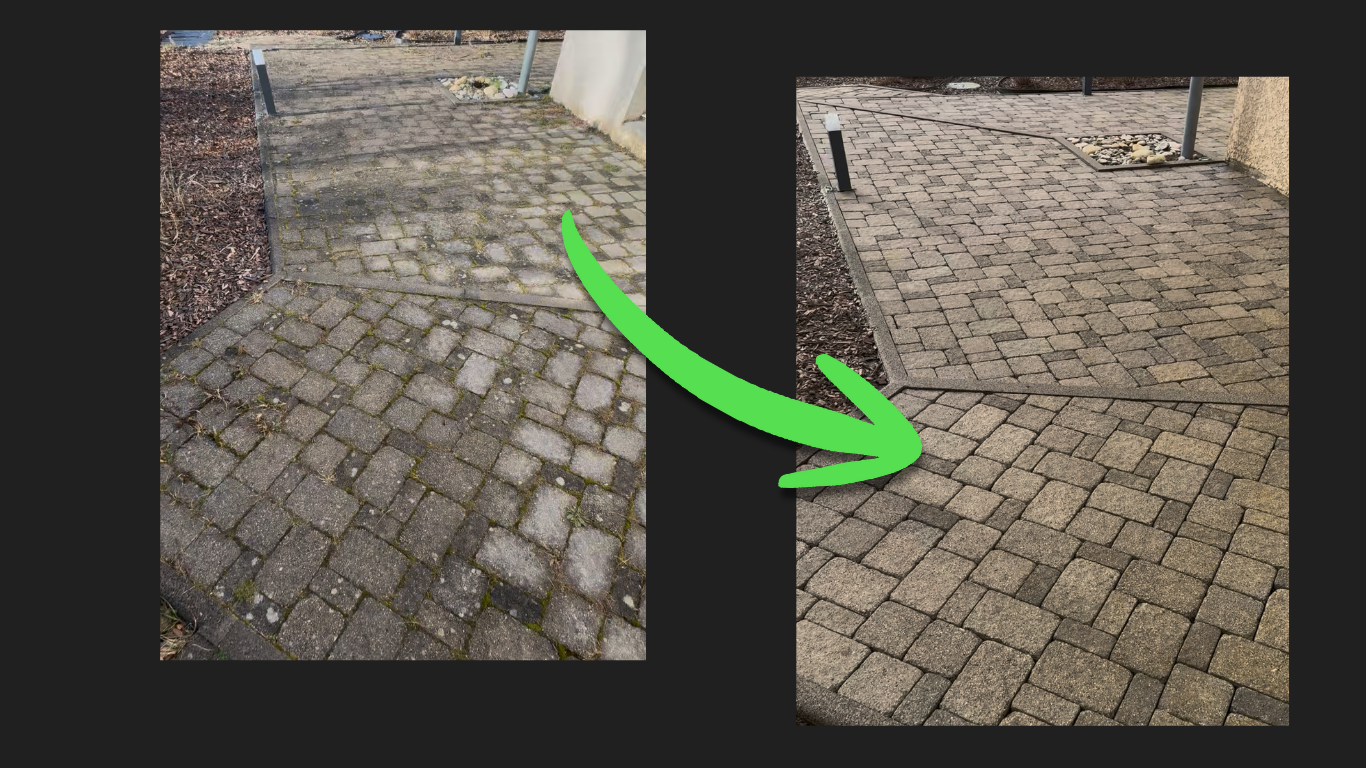 Nous nettoyons terrasses et allées en béton, pavés ou pierre avec des produits adaptés au support.